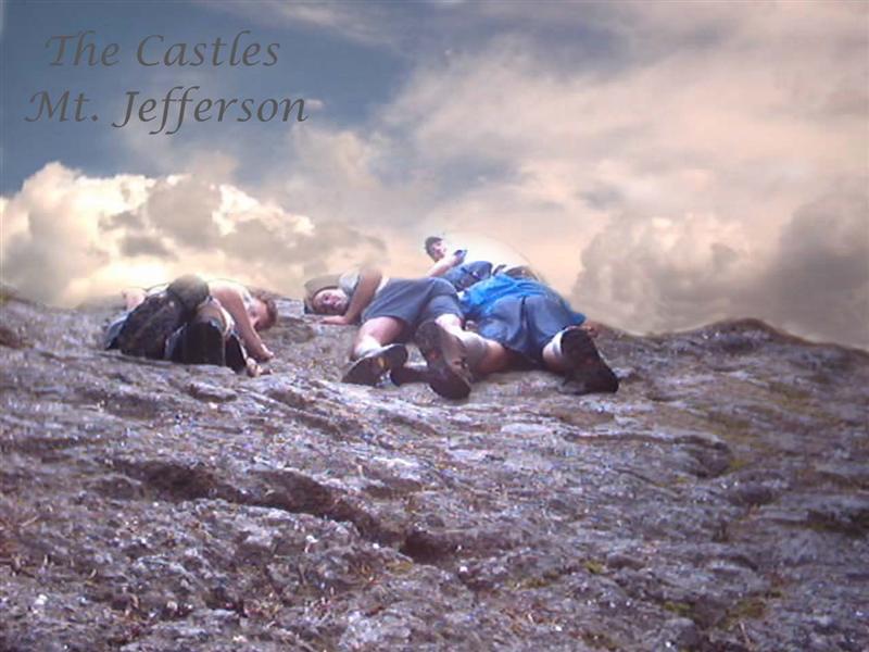 Mr. McCormick and Dave were the early risers Monday morning as they shuffled cars around so one was at our ending point. Everyone else was awakened (or at least told to get out of their tents) at about 6:30. After an exchange of “what a rough night of sleep” stories, we took down camp, before we headed to the van to retrieve our packs, eat breakfast, study the Bible more, and distribute group supplies among everyone’s packs. All this being accomplished, we headed up the Caps Ridge Trail which heads up Jefferson. We stayed on this trail until we met The Link trail, where we turned left and headed across Jefferson towards Castle Trail. Upon reaching Castle trail, after a hike through varied scenery on The Link trail, we headed down Jefferson slightly towards Mt. Bowman, until we found a suitable campsite. To everyone’s surprise, we arrived at a campsite quickly (at around 12) and were able to set up camp and eat lunch in our second campsite of the trip. It did not take us long to realize that we would need more water (and we were planning on have to get water at each campsite), so Mr. McCormick decided to go with Carl and Brian to get water farther along The Link trail. This turned out to be quite an adventure as they had to hike a long way down a steep trail to reach water and then carry the water back up this hard trail. Mike was very nice and hiked part of the way down the trail and helped them carry the water part of the way back to camp. While they were doing that, the rest of us took a pack-less hike up to the Castles, which are large rocks that stick up along a ridge running off of Jefferson. We spent quite a time scrambling over these rocks and enjoying the view, before radioing ‘the water party’ and deciding to head down to help them and start cooking supper. That evening we enjoyed our first freeze-dried meal! After supper and cleaning dishes (using precious water sparingly) we huddled around a campfire, studied more about Faith from the life of Abraham, before singing hymns and Young People’s songs, and heading to sleep at about 9:00. (After hanging our first bear bag, a daily chore, that we successfully executed each day so that no animals got at our food!)