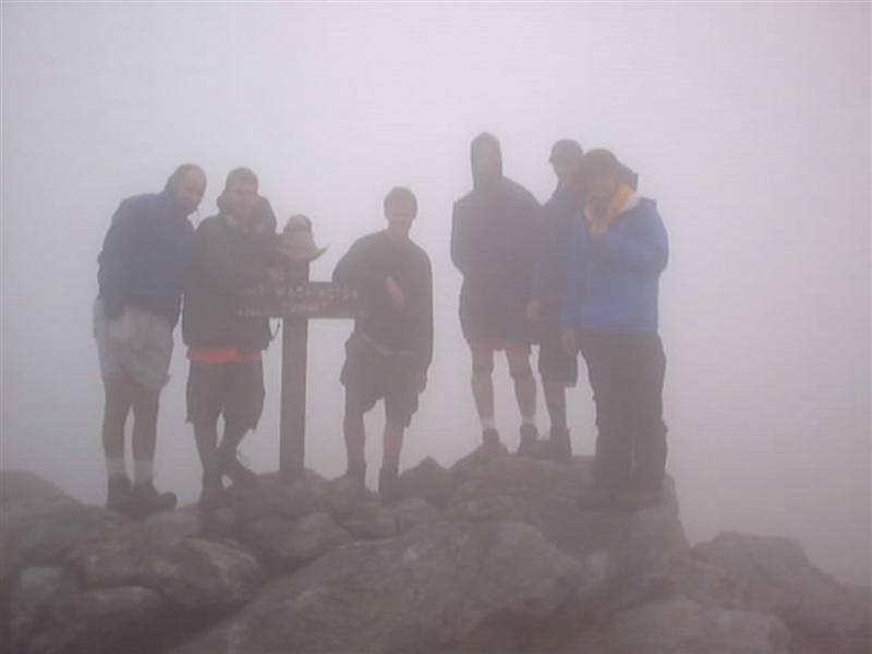 We all awoke to exchange stories of being kept awake by heavy breathing on the part of a fellow camper. Putting that behind us, we got our packs ready, still being unsure of what the plan would be for the day. We had planned on taking a packless hike up Washington, but a quick look out one of the windows of the hut told us that that would prove to be interesting because it was total white out fog out side. Before doing anything else, we headed to a very welcome hot breakfast of ‘grits’ (hot cereal), pineapple, cold cereal, corn muffins, and eggs (possibly an omelet, it didn’t look or taste quite like a normal scrambled egg anyway). After breakfast, we had our morning Bible study, and decided that some wanted to summit Washington even in the fog. This morning summit was taken at a much slower pace then the previous nights summit push. Mr. McCormick, Dave, Justin, Josh, Carl, Peter, and Brian all made it to the summit Friday morning. After a few phone calls from the top, we headed back to the hut to pick up our packs and those who had stayed at the hut (having summated the night before and not wishing to repeat the feat). Leaving the hut, Mr. McCormick, Josh, Jonathan, Brian, and Peter headed up over Mt. Monroe along a branch of Crawford path, while the rest of the group went around Mt. Monroe on a different part of Crawford path. As both groups were meeting at the convergence of the two parts of Crawford path, it started to rain and hail! (even though the forecast had said partly cloudy with a chance of a thunderstorm late in the day!) Everyone scrambled to get their rain gear on, but the rain was coming down so hard that everyone was still getting wet. We continued along Crawford path in the rain, at a quicker pace as we heard one or two rolls of thunder, before we headed down Edmands Path, toward where one of the vehicles had been parked. Before too long we got below tree line and were headed downhill. The plan was to camp at the bottom of Edmands Path, only a short distance from the truck, where we would pack out early Sat morning, instead, we went straight to the truck where Mr. McCormick went to get the van. After a quick phone call to Mr. Lucia, it was decided that we would head to MA and spend the night at Peter’s house Friday night instead of Sat night as planned. After getting all the packs packed into the truck and changing into dryer clothes (everyone was soaked right through) we piled in to the cars, and started the drive home. We stopped for a supper/lunch at pizza hut where we ate 4 pizzas, before we arrived at the Lucia’s house at about 9 pm. After spreading wet stuff everywhere (in hopes it would dry), a quick dip in the pool, and a much needed shower, we headed to bed (or at least pretended to [some {Justin, Mike, Ben, & Peter} stayed up until ~2:30 playing games, listening to music, and burning CDs with pictures from the trip for everyone]).